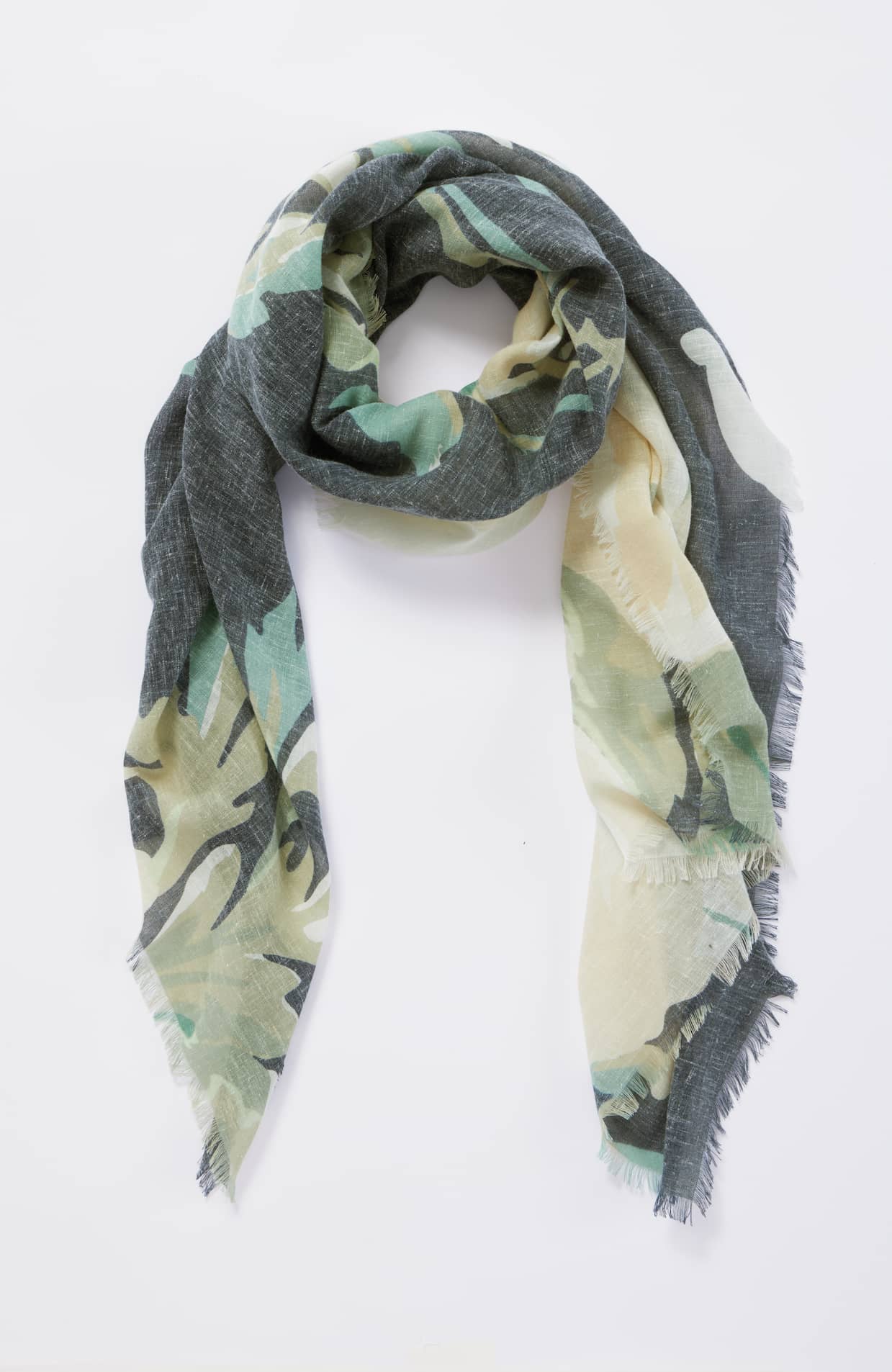 A lightweight layer for now and later, our large-scale floral scarf features an artisanal two-toned washed effect for a slightly faded finish. It's wonderfully soft with a beautiful drape. Eyelash fringe.