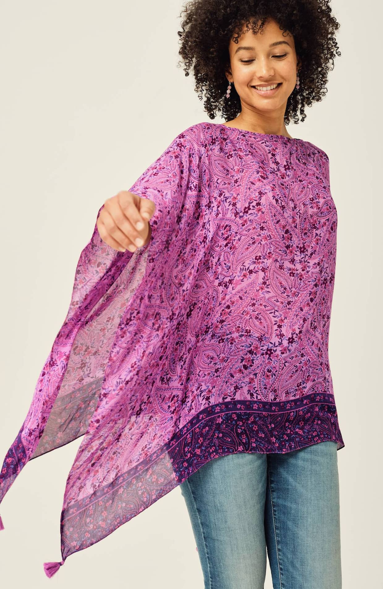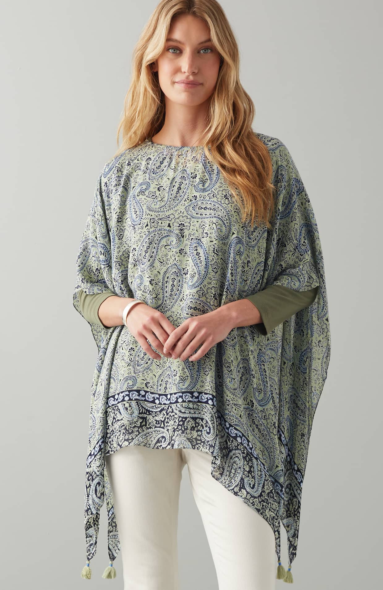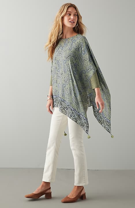 Our boat-neck poncho is extrasoft and light with an allover floral print and complementing border print. A tassel at each end of the handkerchief hemline adds a touch of fun. You’ll love it throughout the spring and summer over a tank or cami with jeans, crops or a skirt on beach days, vacation days and every day.