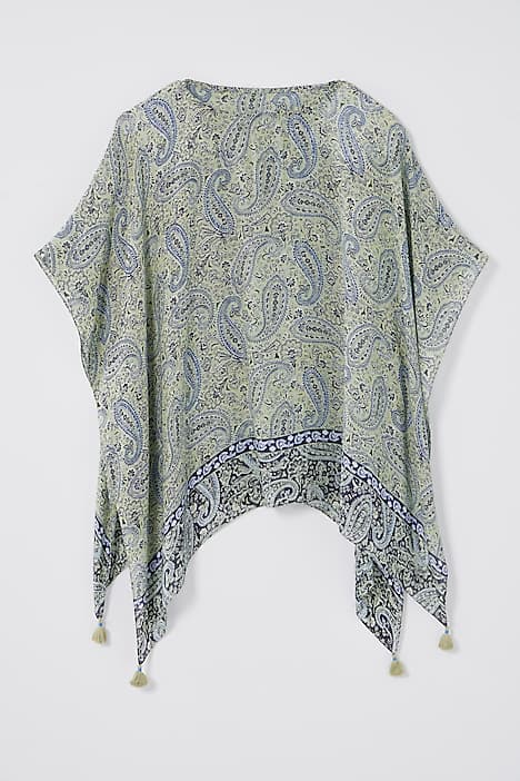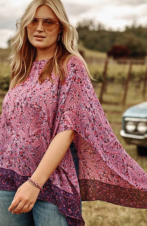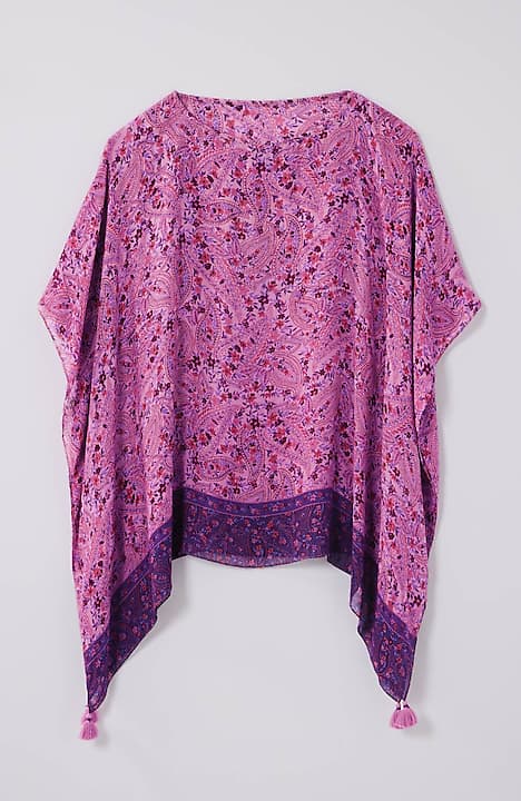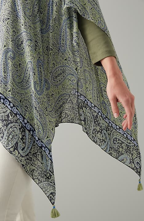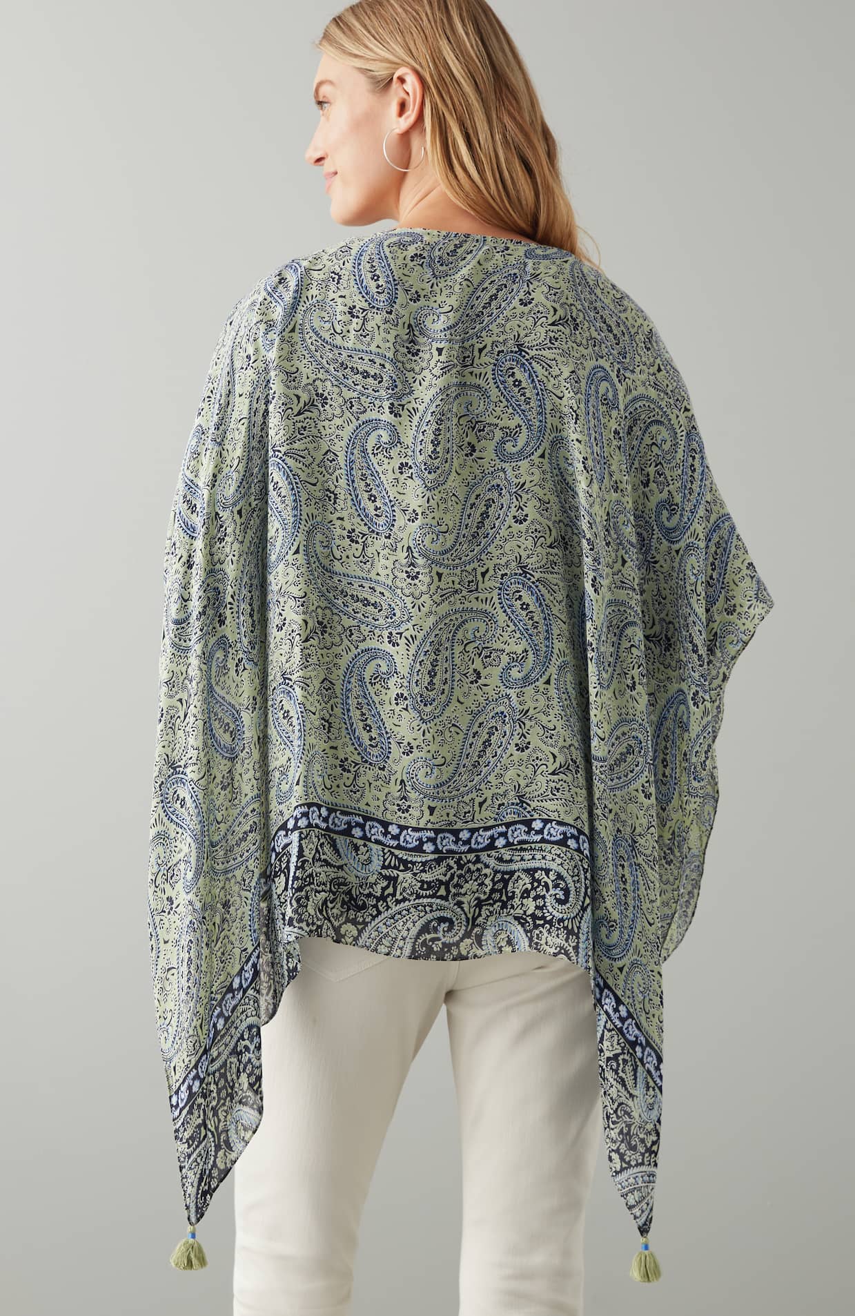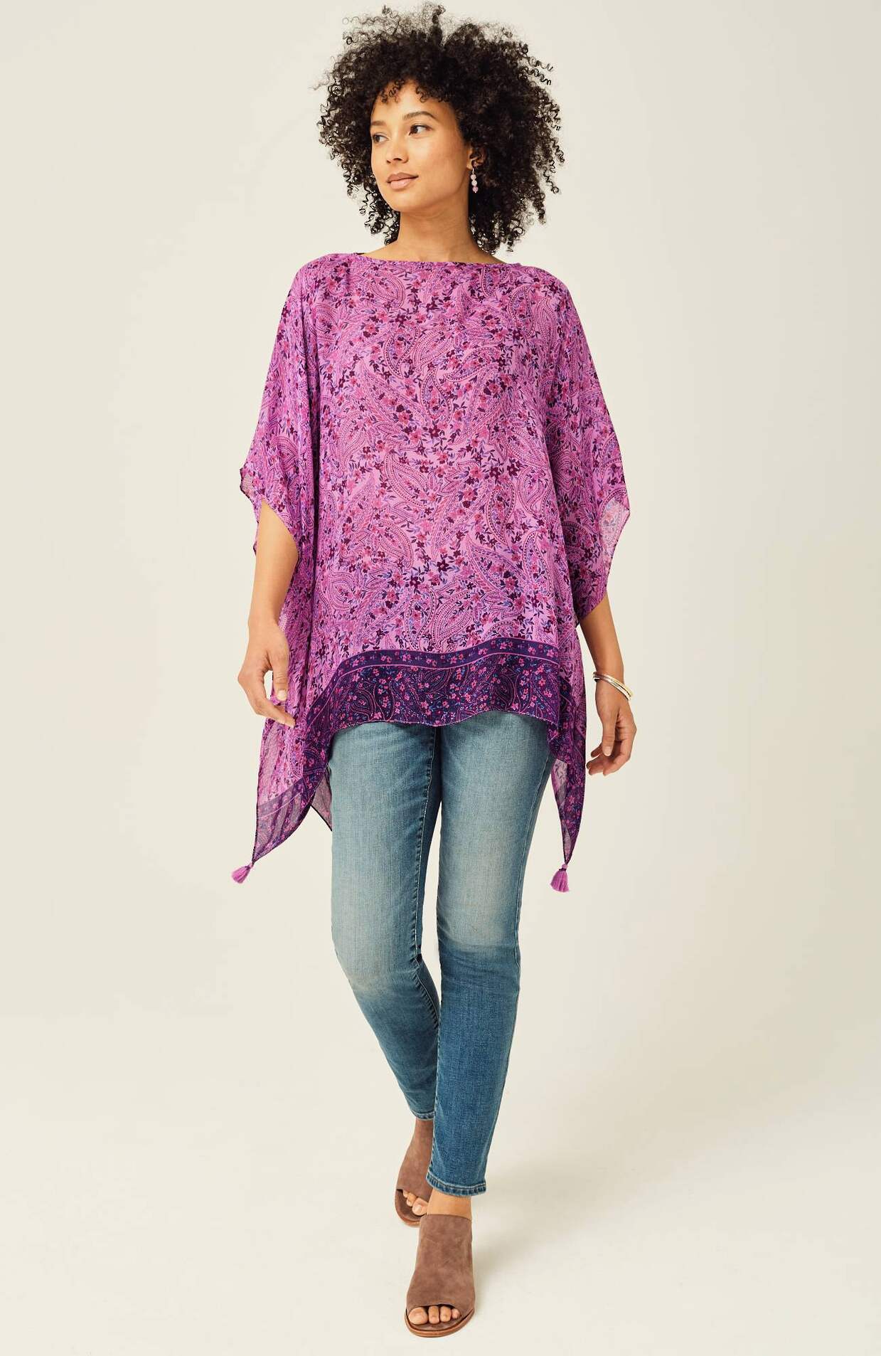 Our boat-neck poncho is extrasoft and light with an allover floral print and complementing border print. A tassel at each end of the handkerchief hemline adds a touch of fun. You’ll love it throughout the spring and summer over a tank or cami with jeans, crops or a skirt on beach days, vacation days and every day.
