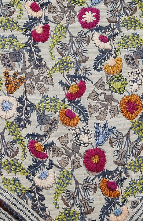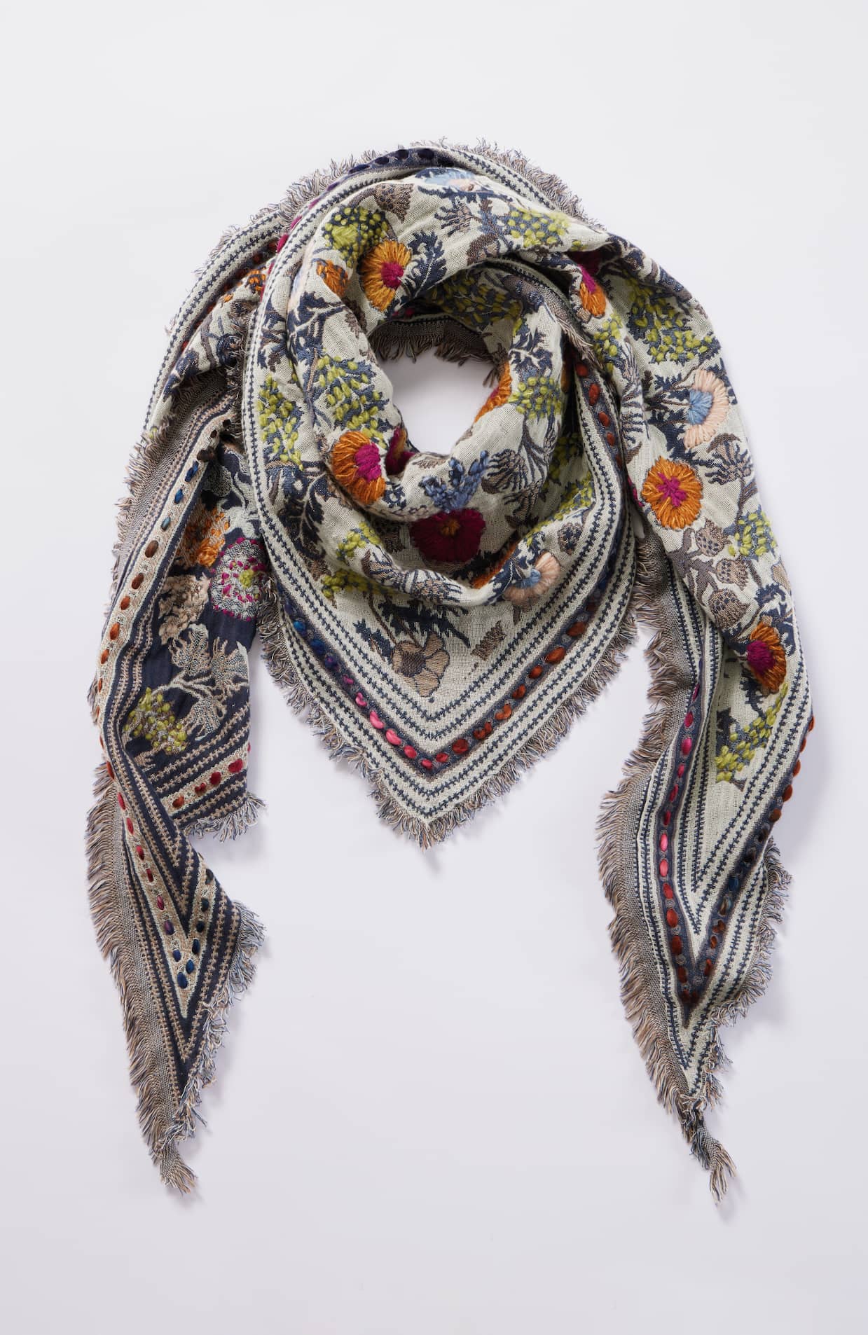 Our supremely soft cotton scarf is designed with a jacquard base and hand embroidery on top for a unique finish. In your favorite triangle shape, this mid-weight piece will carry you through the season. Eyelash fringe.